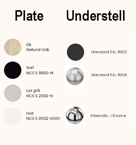 Bordplate leveres standard i eik, hvit, lysegrå eller svart laminat.